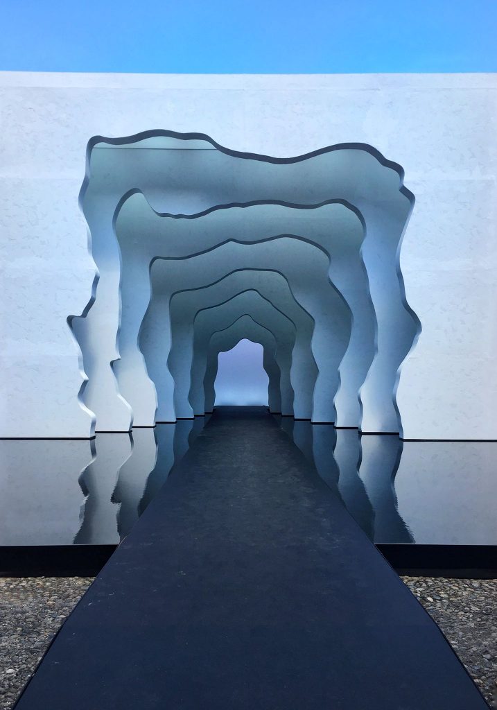 “Divided Layers” is a site-specific installation built upon the duo’s release of Rock.01 – a 3D printed sink Daniel Arsham designed in collaboration with Kohler. The installation consisted in a large-scale immersive art experience made of a series of stacked panels combined to form a walkable tunnel. A pond acting as a mirrored surface doubled and reflected the opening of the cavernous volume, contributing to create a sense of movement and flow.